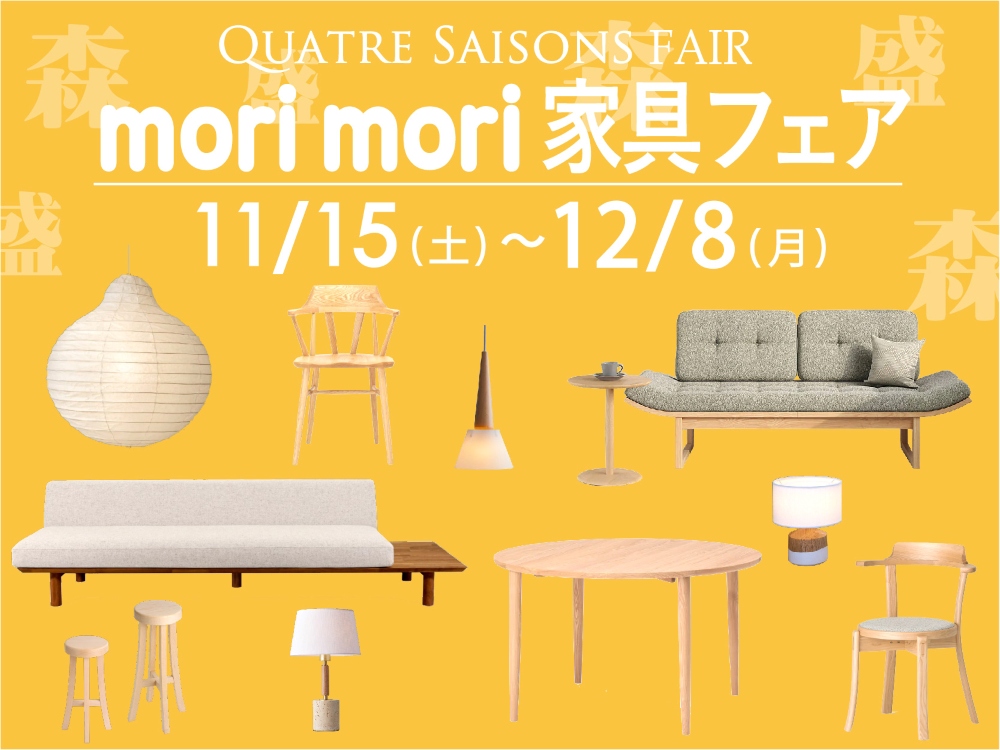 morimori家具フェア11/15~12/8 2025年11月15日(土)~12月8日(月)までmorimori家具フェアを開催します。家具のご購入金額に応じて、morimori家具フェア限定の豪華プレゼントをご用意しております。家具プ、カーテン・ウッドブラインドや三協アルミのウッドデッキ(1926×1065)などのプレゼントなどをご用意しております。morimori家具フェアでしか貰えないプレゼントを数多く揃えております。是非この機会にご来店ください。 プレゼント商品一部ご紹介 展示商品一部ご紹介 HOME PAGE