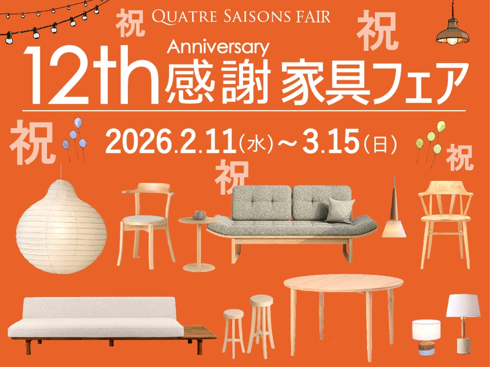 12周年感謝家具フェア 12周年 特別割引 開催! 2026年2月11日(水)~3月15日(日)に12周年感謝家具フェアを開催します。感謝の気持ちを込め、周年フェア期間中だけの特別価格でのご案内をご用意しております。家具職人のつくる上質な家具を是非この機会にご体感ください。12周年外構フェアも同時開催しますので、お気軽にご相談ください。 ※対象は家具・カーテン・小物ですが一部対象外の商品がございます。ご了承ください。 12周年感謝くじ 10万円以上ご購入の方に特別なプレゼントくじをご用意しております。 フェア対象商品一部ご紹介 HOME PAGE